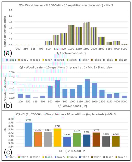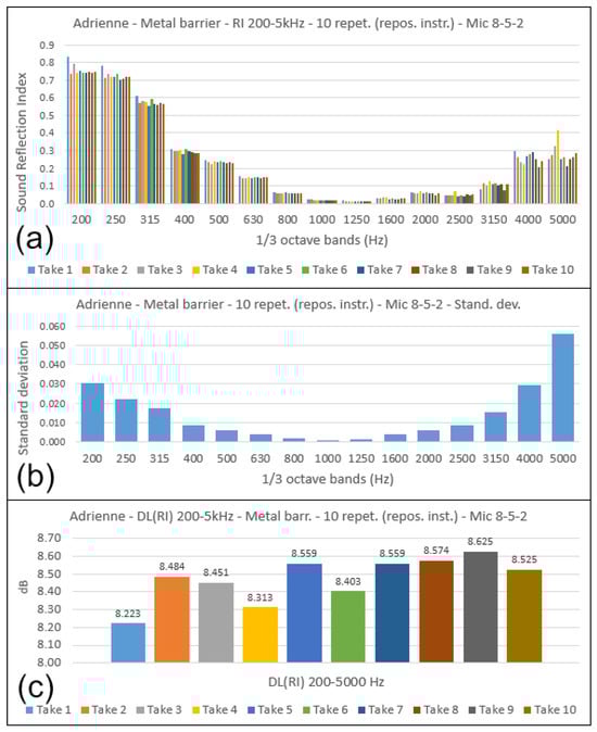 Figure 7 shows 10 measurements taken from the single microphone 3 of the vertical antenna, i.e., the microphone located at the height of the acoustic source. Figure 7a shows the 10 Sound Reflection Index values, in third-octave bands, Figure 7b plots the standard deviation for each frequency band, and Figure 7c plots the 10 DLRI in the 200 Hz–5 kHz range for each measurement. It can be seen that the variation between the individual measurements for each frequency band is very low, confirming that the measurement system works well. The DLRI values vary slightly between each other: their standard deviation is approximately 0.02 dB.