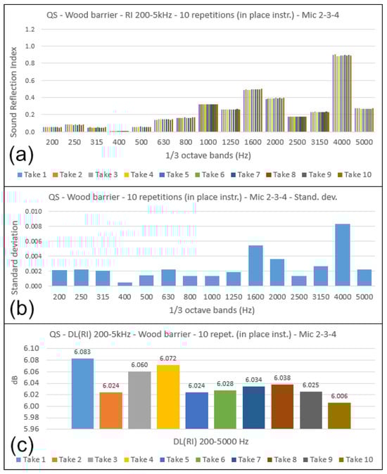 Figure 26 shows the repeatability measurements (average of the three central vertical microphones) carried out in situ with the Adrienne system [] on a different type of noise barrier made in wooden panels and concrete, visible in Figure 2. The RI and DLRI values are different from those in Figure 25, but it is worth noting that the standard deviations over the 10 measurements are of the same order of magnitude as those of the measurements with the Quick System.