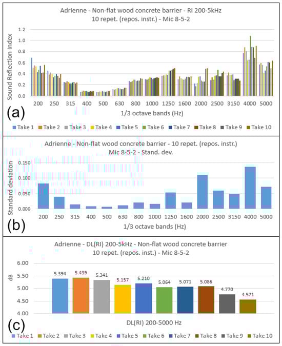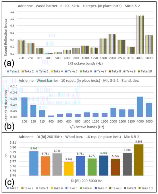 Repeatability measurements of RI with the Adrienne system made in situ near Verona on a noise barrier made in wooden panels and concrete, repositioning the instrumentation, average of microphones 8, 5, and 2; 10 measurements. (a) Sound Reflection Index values; (b) standard deviation of measurements in (a); (c) DLRI in the 200 Hz–5 kHz range of data in (a).