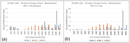 Figure 10 provides a comparison of the Sound Reflection Index measured in front of the OSB3 barrier with the Adrienne system (Figure 10a) and the Quick System (Figure 10b), separating the individual microphones placed in the same geometric positions: microphone 2 of the Quick System’s antenna is exactly in the same position as microphone 8 of the Adrienne grid; microphone 3 of the antenna used by Quick System is exactly in the same position as microphone 5 of the Adrienne grid (on axis with the source); microphone 4 of the Quick System’s antenna is exactly in the same position as microphone 2 of the Adrienne grid. Substantial agreement can be seen, except for small differences due to slight differences in positioning in front of the non-flat barrier and slight increases of RI values in the lower frequency bands in the case of the Adrienne system, greater when the microphones are not on the axis with the source.