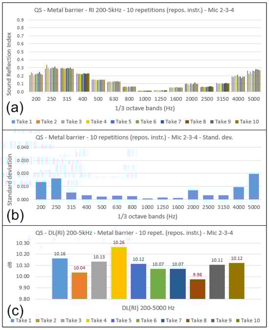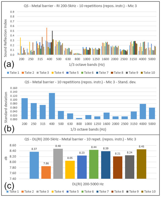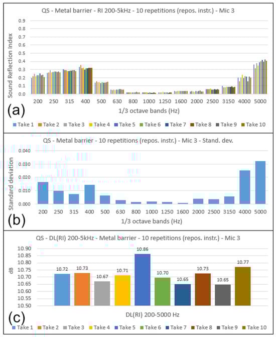 RI repeatability measurements with Quick System in situ and instrumentation repositioned on a flat metal barrier, microphone 3; 10 measurements. (a) Sound Reflection Index values; (b) standard deviation of measurements in (a); (c) DLRI in the 200 Hz–5 kHz range of data in (a).