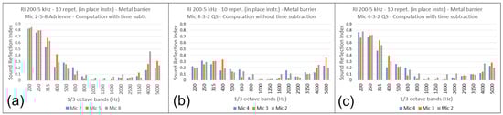 Sound Reflection Index measurements on the flat metal barrier with the Adrienne and Quick System. (a) RI from microphones 2, 5, and 8 from the Adrienne system; (b) RI from microphones 4, 3, and 2 from the Quick System processed without time subtraction; (c) RI from microphones 4, 3, and 2 from the Quick System processed with time subtraction from the Adrienne software, version 1.8.