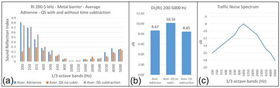 Figure 14 shows a comparison of the Sound Reflection Index calculated from the signals from the three central microphones measured with the Adrienne system on the flat metal barrier (Figure 14a) and with the Quick System (Figure 14b), computed on board without time subtraction of the tail of the direct response from the reflected response []. Figure 14c shows the data measured from Quick System but processed with the Adrienne system software, version 1.8, with time subtraction. As expected, the RI values in Figure 14c are fully compatible with those measured with the Adrienne system (Figure 14a). The same data from Figure 14 were averaged and plotted in a single graph in Figure 15a. Figure 15b also shows the DLRI values calculated in the 200 Hz–5 kHz range from the three previous cases: it can be seen that the data measured with the Adrienne system and with the Quick System processed with time subtraction differ by only 0.22 dB, while the onboard processing of the Quick System without time subtraction yields slightly different DLRI values (approx. 1.5 dB difference). In the case of the OSB3 wooden barrier, which is less reflective than the metallic one, the DLRI values obtained by Adrienne and QS without subtraction differ by a smaller amount (about 0.2 dB). Figure 15c shows the normalized traffic noise spectrum, which is used to ‘weight’ the RI values for the DLRI calculation: it can be seen, nevertheless, that the values in the lower and higher frequency bands influence the definition of the single-number rating to a lesser extent than the values in the middle-frequency bands. This point will be further discussed in paragraph 5.