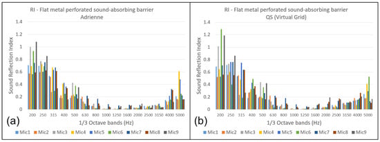 Sound Reflection Index measured on the flat metal barrier. (a) RI measured with Adrienne system, values from individual grid microphones; (b) RI measured with Quick System and ‘virtual grid’, values from individual virtual microphones.