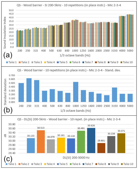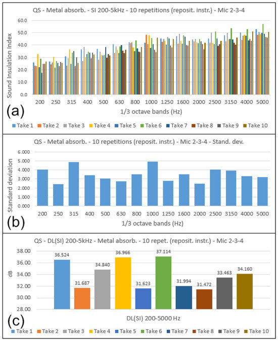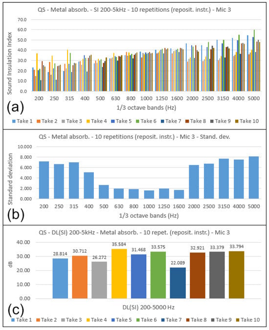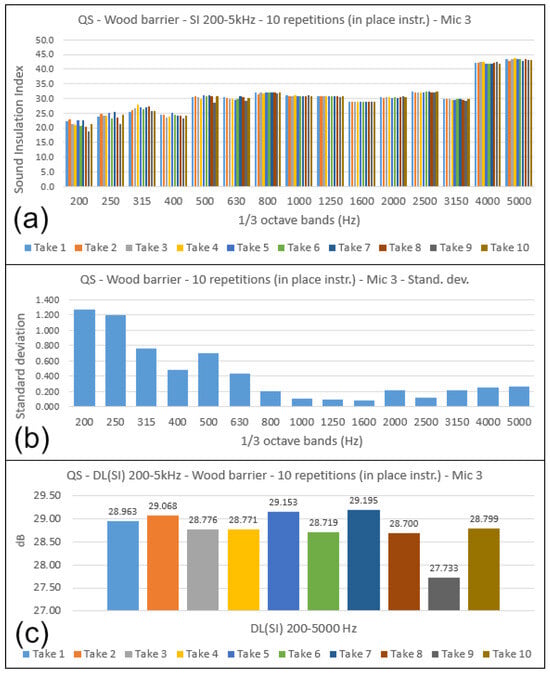 SI repeatability measurements with Quick System in situ and instrumentation repositioned on a flat metal noise barrier, average of microphones 2, 3, and 4; 10 measurements. (a) Sound Insulation Index values; (b) standard deviation of measurements in (a); (c) DLSI in the 200 Hz–5 kHz range of data in (a).