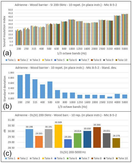 Figure 17 shows 10 measurements plotted from the single microphone 3 of the vertical antenna, i.e., the microphone horizontally aligned with the sound source. Figure 17a shows the 10 Sound Insulation Index values, in third-octave bands, Figure 17b plots the standard deviation for each frequency band, and Figure 17c plots the 10 DLSI values, in the 200 Hz–5 kHz, from each measurement. There is an increase in the standard deviations on the measurements at low frequencies. The standard deviation on the single-number ratings in the 10 measurements is approximately 0.4 dB.