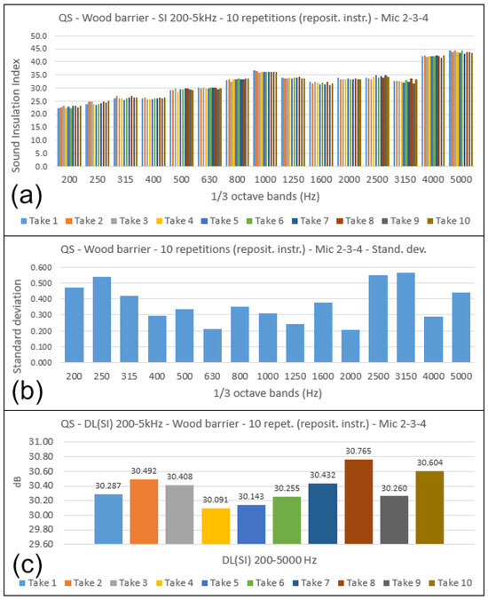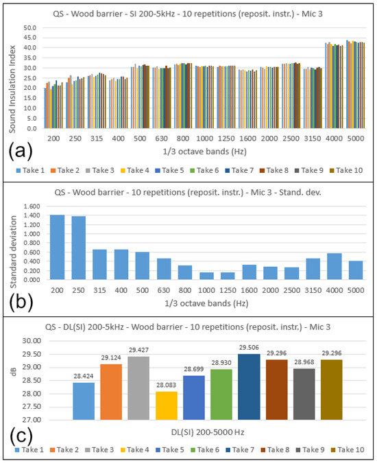 A series of 10 measurements of the Sound Insulation Index performed with Quick System on the OSB3 barrier, visible in Figure 5b, have been conducted; the sound source and microphone antenna were left in place during the measurements. It is, therefore, possible to estimate the repeatability of the system applied to SI measurements, regardless of positioning errors.