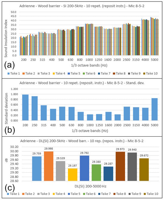 SI repeatability measurements with Adrienne system and instrumentation repositioned on OSB3 barrier, average of microphones 8, 5, and 2; 10 measurements. (a) Sound Insulation Index; (b) standard deviation of measurements in (a); (c) DLSI, in the 200 Hz–5 kHz range, of data in (a).