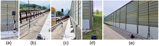 In-situ measurements on a flat metal barrier. (a) RI measurement on the roadside surface of the noise barrier; (b) free-field measurement; (c) SI measurement, loudspeaker on the roadside; (d,e) SI measurement with microphone antenna on the noise barrier side opposite to the roadside.