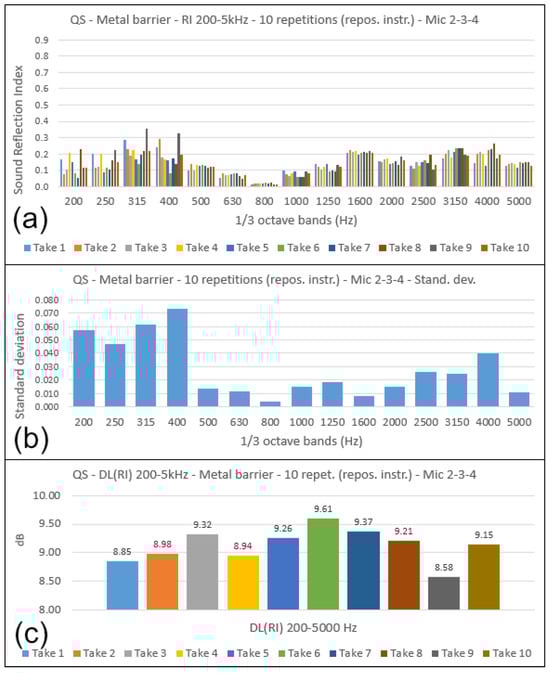Repeatability measurements with Quick System and instrumentation repositioned in front of the sound-absorbing perforated metal barrier, microphone 3; 10 measurements. (a) Sound Reflection Index; (b) standard deviation on values in (a); (c) DLRI, in the 200 Hz–5 kHz range, of data in (a).