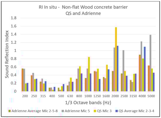Figure 27 shows a comparison of measurements made in situ on the wood-concrete noise barrier, visible in Figure 2 and Figure 3, with both the Adrienne and the Quick System. Both RI values from the single on-axis microphones of the respective measurement systems (microphone 5 for the Adrienne system, microphone 3 for Quick System) and the vertical groupings of 3 microphones analyzed previously for the two systems are analyzed. A good agreement of the results averaged over three microphones can be observed. In this case, the QS values analyzed are those processed onboard the system without signal subtraction in the time domain. When measuring mild absorbing noise barriers, like in this case, the differences shown above on the metal barrier in the laboratory become less important. The DLRI values in the 200 Hz–5 kHz range calculated in the 4 cases are: DLRI QS Mic 3 = 2.2 dB; DLRI Adrienne Mic 5 = 2.9 dB; DLRI QS Mics 2,3,4 = 3.6 dB (processed without subtraction in the time domain); DLRI Adrienne Mic 8,5,2 = 4.5 dB (processed with subtraction in the time domain).