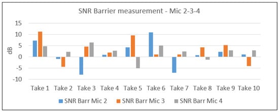 Measurements were performed on several microphones, as described below. The analysis of one single microphone can be considered the ‘worst case’, from which to extrapolate data on the limits of the measurement system and method. Analyses of the average across multiple microphones include a larger portion of the barrier in the calculation, resulting in more useful information and improve some measurement parameters (e.g., better SNR) by averaging multiple signals.