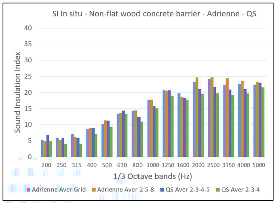 In order to confirm that the problem found at the Isera site was caused by a poor SNR ratio, comparative SI measurements, carried out both with the Adrienne system and the Quick System, were conducted at the Verona Nord site on the wood-concrete barrier visible in Figure 2 and Figure 3, of which RI had already been measured (Figure 27). Figure 31 shows a comparison of the Sound Insulation Index measurements from the Adrienne system and the Quick System, processed according to different combinations of microphones: Adrienne full nine-microphone grid, Adrienne 3 central vertical microphones, Quick System microphones 2, 3, 4, and 5 and Quick System microphones 2, 3, and 4. Figure 31 shows a very good agreement between the two systems. In this case, the barrier has a smaller sound insulation than the metal noise barrier discussed in the repeatability measurements, so the problem of poor SNR did not arise. The DLSI 200 Hz–5 kHz values obtained from the comparative measurements are as follows: DLSI Adrienne grid: 13.0 dB; DLSI Adrienne microphones 2-5-8: 12.9 dB; DLSI Quick System microphones 2-3-4-5: 12.8 dB; DLSI Quick System microphones 2-3-4: 11.2 dB.