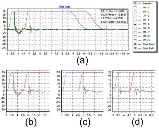 Figure 32 shows an example of signal subtraction in the time domain, the purpose of which is to eliminate the ‘contamination’ of the first part of the reflection by the direct signal, being they partially overlapped in the reflected impulse response. Figure 32a shows both impulse responses: free-field, in green, and reflected, in gray; in this example, the positioning had been quite precise, and the initial parts of both responses appear to overlap well. In Figure 32b, the detail of the reflected response only, without the free-field overlap, can be seen. Figure 32c shows the result of the time–domain subtraction performed by the Adrienne software, version 1.8, with the fine alignment described above: it can be seen that the direct part is almost zeroed, as is the part of the direct response superimposed on the reflected part. Figure 32c shows the time–domain subtraction result without the ‘fine’ alignment search (in practice, the software was set to search in discrete steps instead of fractions of a sample). It can, therefore, be seen that even when the responses seemingly appear to overlap, they actually do not, and performing the time–domain subtraction would do more harm than good, creating worse artefacts in the reflected part than performing no subtraction at all. Research is currently underway into a new alignment algorithm that requires fewer computational resources and can be implemented on board the Quick System. It was found, however, that the differences between processing with and without subtraction emerge only at low frequencies, and these are taken into account only slightly by the normalized road traffic noise spectrum [], which is A-weighted. So, in the worst case, i.e., on very reflective noise barriers, differences of 1–1.5 dB from the full Adrienne method in the RI calculation could occur; on sound-absorbing noise barriers, in general, these differences are smaller and acceptable. In any case, if required, the data measured with Quick System can be re-processed with the Adrienne software, version 1.8, at a later time to have a calculation with subtraction and results equivalent to those measured with the Adrienne system. However, it is worth remarking that for a quick in-situ check of the noise barrier, this perfect coincidence is not necessary; what is needed is the order of magnitude of the average performance on a large number of test points and its variability.