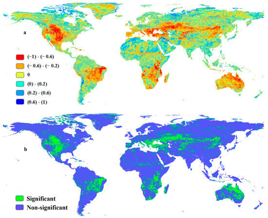 Figure 1 presents the correlation map of LST-NDVI categorized into six classes (a) and the distribution of significant versus non-significant pixels (b). As depicted in Figure 1a, a substantial portion of the map is dominated by classes exhibiting negative correlations between LST and NDVI. These negative correlations, represented in red, are predominantly concentrated in the western regions of the United States, Brazil, southern Africa, northern Australia, and countries such as Türkiye, Greece, Bulgaria, and Kazakhstan. This spatial pattern aligns with expectations, as negative LST-NDVI correlations often indicate areas where increasing temperatures suppress vegetation activity. However, not all pixels on the map exhibit statistically significant correlations at a p-value threshold of <0.05. To address this, we generated a separate classification of significant pixels, which is illustrated in Figure 1b. This visualization isolates areas where correlations are statistically robust, providing a clearer understanding of the regions where the relationship between LST and NDVI is most pronounced and reliable.