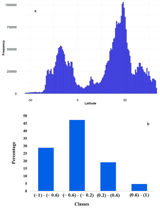 Figure 2a illustrates the latitudinal distribution of significant LST-NDVI correlations, revealing distinct patterns along the latitudinal gradient. The figure highlights two prominent peaks in the distribution. The first peak occurs between latitudes −40 and 0, indicating a notable concentration of significant correlations in the Southern Hemisphere’s tropical and subtropical regions. The second, more pronounced peak spans latitudes 30 to 55 in the Northern Hemisphere, encompassing temperate zones where the majority of significant correlations are observed. These peaks suggest that the relationship between LST and NDVI varies with latitude.