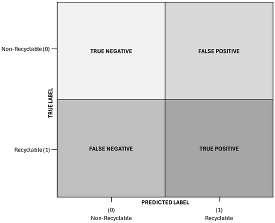 For this study, as the model is based on a binary label, the matrix is represented as a table of four quadrants (two rows and two columns). Each row represents the actual instances and each column the predicted ones, allowing an assessment of the accuracy of the model by showing the counts of true (positive and negative) and false (positive and negative) predictions. True positive cases are those where the model correctly predicted the positive class (recyclable), while true negative cases are those where the model correctly predicted the negative class (non-recyclable). Conversely, false positives are cases where the model predicted a positive class when it was truly negative, and false negatives are cases where it predicted a negative class when it was actually positive. This is represented in Figure 3.