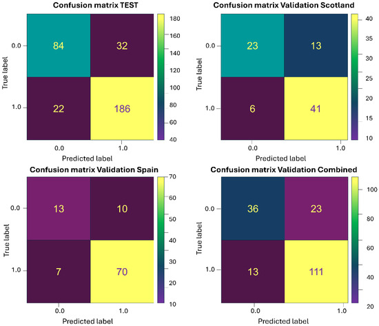 Overall, the model performed well in terms of accuracy in the validation datasets, having the highest in the Spanish dataset, with an accuracy of 83%; the lowest in the Scotland validation dataset, with an accuracy of 77%; and a combined accuracy of 80%.