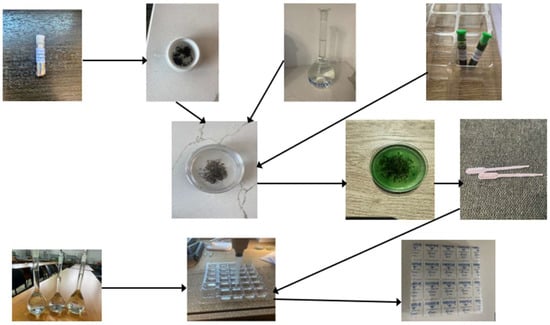 Parafilm strips were placed over the test plates to minimize solution evaporation during the incubation period. A transparent lid was placed over the plates, and incubation was conducted in darkness at 22 °C. Each experimental condition, including the unpolluted control group, was performed in four replicates. Figure 1 illustrates the experimental procedures carried out.