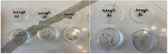 After 42 h of incubation in polluted freshwater with different metal concentrations, the first neonates began to emerge. Figure 2 shows some of the experimental conditions used.