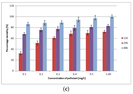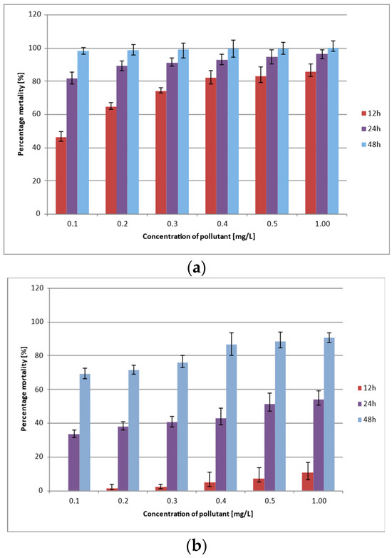 Cadmium was the most toxic heavy metal for water fleas. Their mortality rate increased by 39.29% within 12 h when exposed to concentrations from 0.1 mg/L to 1.0 mg/L. After 24 h of exposure to Cd2+, the mortality rate ranged from 81.66% (0.1 mg/L) to 96.42% (1.0 mg/L), while, after 48 h, it ranged between 98 and 99% and reached 100% at the highest applied concentration.