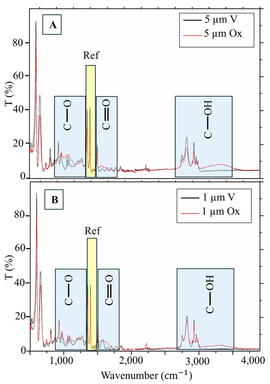 MPs FTIR spectra obtained for different MPs sizes, both virgin and oxidized, are reported in Figure 1A,B.