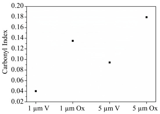 As further evidence of photo-oxidation, as the ageing process progressed, the carbonyl index value increased, as reported in Figure 2. The photo-ageing process was further confirmed by the variation of Iox (Table 1), calculated for the aged samples and compared to a standard PS sample.