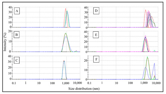 Size distribution obtained by Dynamic Light Scattering of the MPs 1 μm in virgin conditions (A), oxidized (B), and with adsorbed BaP (C), and MPs 5 μm in virgin conditions (D), oxidized, (E) and with adsorbed BaP (F).