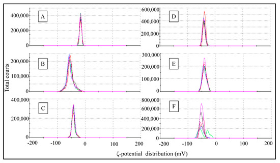 ζ-potential distribution obtained by Dynamic Light Scattering of the MPs 1 μm in virgin conditions (A), oxidized (B), and with adsorbed BaP (C), and MPs 5 μm in virgin conditions (D), oxidized (E), and with adsorbed BaP (F).