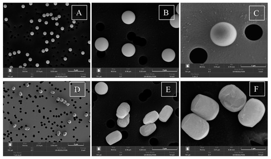 FESEM microphotographs of the MPs 1 μm referred to virgin as (A–C) and oxidized as (D–F), respectively.