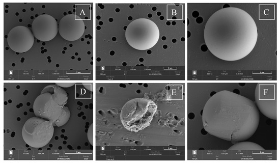The results highlight how oxidation by UVB exposition decreases the mean hydrodynamic radius. Additionally, the smaller hydrodynamic radius of the BaP-loaded particles appears to be due to their distinct behaviour in an aqueous environment. These effects are further illustrated in the diagram reported in Figure 3, where the hydrodynamic radius of the 1 µm MPsv vs. MPsox (Figure 3A,B) and the 5 µm MPsv vs. MPsox are compared (Figure 3D,E). The size distribution peaks show changes as a function of the condition of the sample (virgin and oxidized), thus suggesting that a modification in the surface behaviour induced by UVB exposure likely occurred. These results are confirmed by microphotographic images obtained by FESEM (Figure 5 and Figure 6).