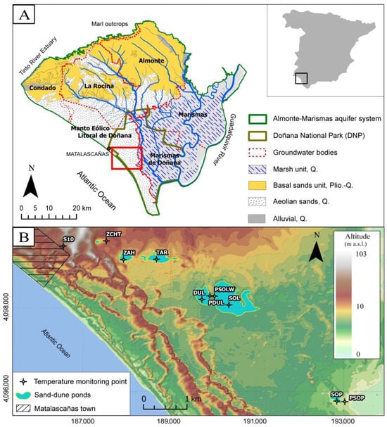 All the ponds mentioned are connected to the aquifer; therefore, they are not perched systems. The water temperature monitoring points in this study were located in these six ponds and in piezometers near the Dulce (PDUL), Santa Olalla (PSOLW), and Sopetón (PSOP) ponds (Figure 1B). Temperature was also monitored in borehole 10 (S10), a supply well for Matalascañas, located only 700 m from the Charco del Toro pond.