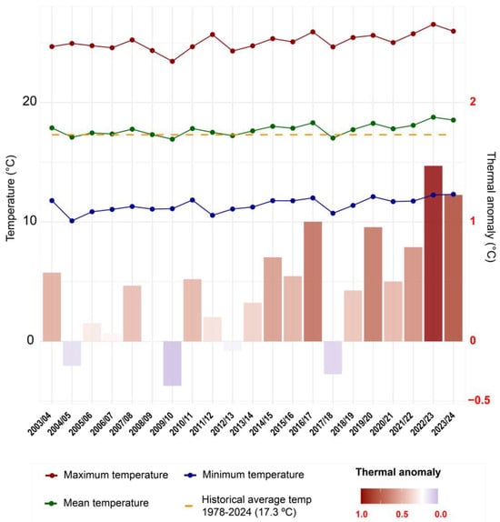 The average annual air temperature for the 2003–2024 period was 17.6 °C, slightly higher than the average for the 1978–2024 period (17.3 °C). While the annual average air temperature remained close to the historical average during the first decade of the 21st century, a sustained increase has been observed since 2014, with thermal anomalies reaching nearly 1.5 °C during the 2022/23 hydrometeorological year. In fact, between 2015 and 2024, the air temperature rose by up to 0.47 °C compared to the 2003–2014 period. This trend persisted throughout the monitoring period, except during the 2017/18 hydrometeorological year, which was relatively cold in this context (Figure 2).