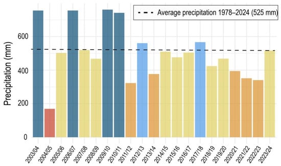 Annual precipitation (mm) recorded at the Almonte meteorological station (2003–2024). The historical average precipitation (1978–2024) of 525 mm was calculated from the daily precipitation data recorded at the Palacio de Doñana meteorological station. Blue bars indicate years with above-average precipitation, while red, orange, and yellow bars indicate below-average precipitation.