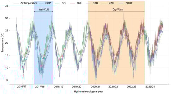 Daily mean temperature of surface and subsurface water for the hydrometeorological years from 2016/17 to 2023/24. SOP: Sopetón pond; SOL: Santa Olalla pond; DUL: Dulce pond; TAR: Taraje pond; ZAH: Zahíllo pond; ZCHT: Zacallón Charco del Toro. Wet–cold and dry–warm years are indicated with shaded color band.