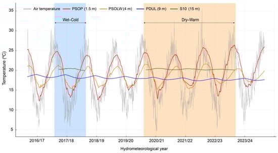 Daily mean temperature of groundwater for the hydrometeorological years from 2016/17 to 2023/24. PSOP: Sopetón piezometer; PSOLW: Santa Olalla piezometer; PDUL: Dulce piezometer; S10, borehole 10. The depth at which the temperature has been monitored inside the piezometer is indicated in parentheses. Wet–cold and dry–warm years are indicated with shaded color band.