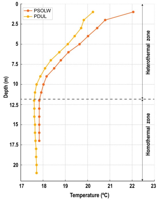 Vertical temperature profiles measured in the PSOLW and PDUL piezometers, highlighting the heterothermal and homothermal zones along the depth gradient.