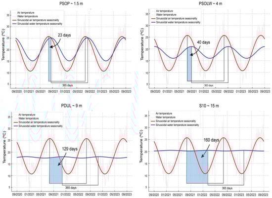In addition to attenuation of thermal signal amplitude with depth, a temporal lag is observed in the annual temperature cycles of groundwater relative to air temperature. Figure 7 illustrates the sinusoidal function representing the variability in air and groundwater temperatures for each piezometer. In reference to the annual cycle, extreme groundwater temperatures occur with a delay relative to air temperature extremes, and this lag increases with depth. At the PSOP, the lag is 23 days, while at the PSOLW, it is 40 days. For the PDUL, the lag extends to 129 days, and at S10 (15 m depth), it reaches 160 days, indicating a complete inversion of the annual temperature cycle. Thus, in deeper piezometers, maximum groundwater temperatures are typically recorded in the winter, while minimum temperatures are observed in the summer.