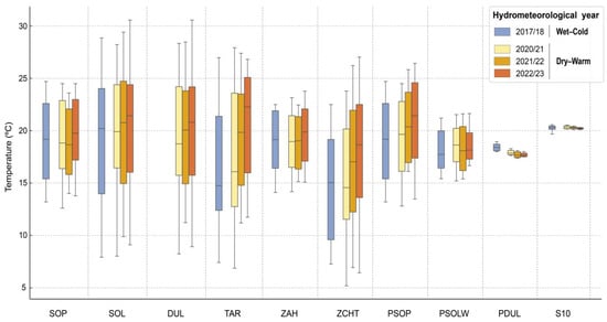 Boxplot of water temperature distributions across monitoring points during the wet–cold (2017/18) and dry–warm (2020–2023) periods. SOP (Sopetón pond), SOL (Santa Olalla pond), DUL (Dulce pond), TAR (Taraje pond), ZAH (Zahíllo pond), ZCHT (Zacallón del Charco del Toro), PSOP (Sopetón pond piezometer), PSOLW (western piezometer at Santa Olalla pond), PDUL (Dulce pond piezometer), and S10 (borehole 10).
