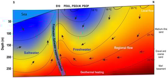 Indeed, as stated by [], the coastline acts as an abrupt thermal transition zone between the continent and the sea. This phenomenon could cause lower temperatures in the underlying area, generating a thermal gradient that extends towards zones farther from the coast. Consequently, the average temperature at S10 might even be lower than that of the PDUL. Figure 9 presents a hypothetical heat transport schematic in the Almonte-Marismas aquifer, based on previous models of heat transport in coastal detrital aquifers [,,], which could explain the thermal regime and trends observed in groundwater temperature, as described in this study.