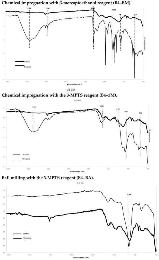 Using the β-mercaptoethanol method, the peaks at 2930–2931 cm−1 and 1734–1736 cm−1 were attributed to the O–CH2 vibrations of β-mercaptoethanol and to C=O ester carbonyl stretching, respectively [24,41]. These results show that the thiol group was grafted to the biochar surface through ester linkages [42]. The peaks at 671–672 cm−1 were assigned to the carbon–sulfur vibration, thus confirming the presence of β-mercaptoethanol in the thiolated biochar [27]. Signals at 1228–1231 cm−1 and 1027–1028 cm−1 were attributed to lactones and to the stretching vibration of C–O [24,43].