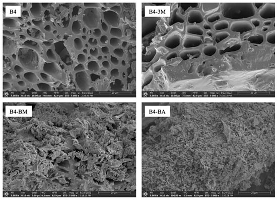 Figure 3. SEM images of pristine biochar (B4), thiolated biochar using β-mercaptoethanol (B4-BM), thiolated biochar with 3-MPTS (B4-3M), and thiolated biochar with 3-MPTS using a ball mill (B4-BA) at a 20 mm scale.