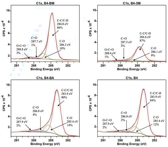 Figure 5. XPS spectra of C 1s for pristine biochar (B4), thiolated biochar using β-mercaptoethanol (B4–BM), thiolated biochar with 3-MPTS (B4–3M), and thiolated biochar with 3-MPTS using a ball mill (B4–BA).