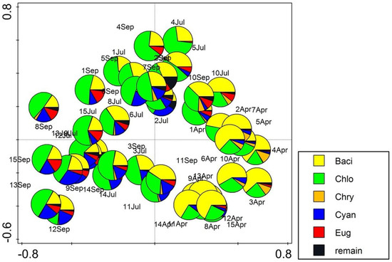 - Konopáčová, E.; Schagerl, M.; Bešta, T.; Čapková, K.; Pouzar, M.; Štenclová, L.; Řeháková, K. An assessment of periphyton mats using CHEMTAX and traditional methods to evaluate the seasonal dynamic in post-mining lakes. Hydrobiologia 2023, 850, 3143–3160. [Google Scholar] [CrossRef]