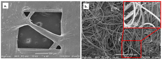 In contrast, the TGA-DTG curves of the NWT material shown in Figure 10 indicate that the first mass loss occurs around 208 °C, likely due to the removal of moisture and volatile compounds. The second major decomposition stage appears between 350 °C and 460 °C, with a mass loss of about 40%, suggesting the degradation of polyester fibers and organic polymers in the textile [25]. In the next phase, between 460 °C and 700 °C, there is an additional 20% loss, associated with the breakdown of the material’s more stable components.