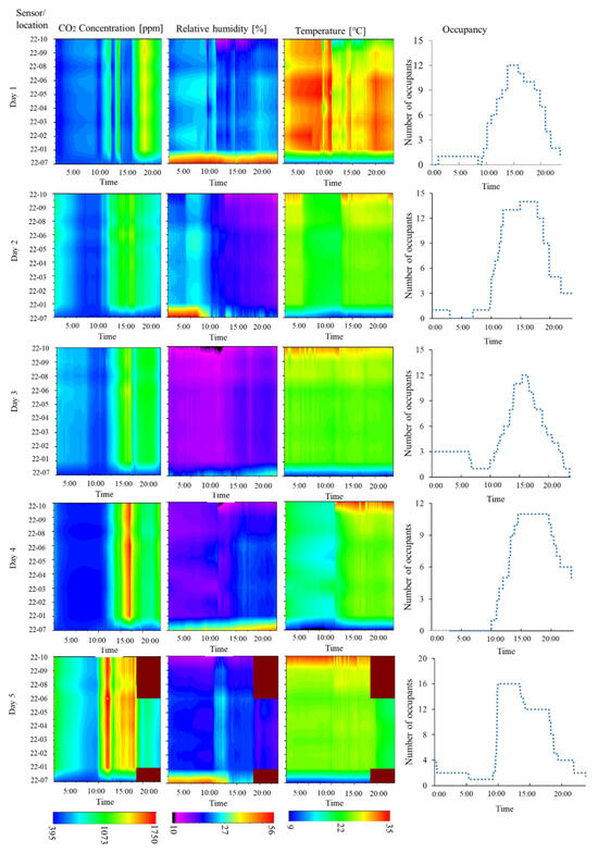 | Day | Max | Min | Median | Geometric Mean | Max | Min | Median | Geometric Mean | Occupants | Co-Presence Duration [h] |