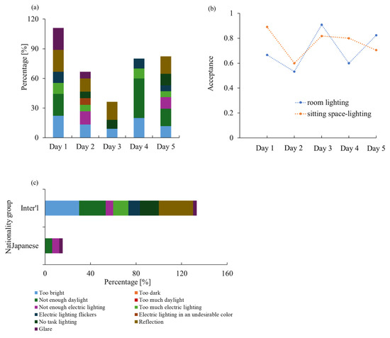 | Too bright | Too dark | Not enough daylight | Too much daylight | Not enough electric lighting | Too much electric lighting | |||