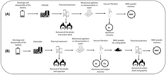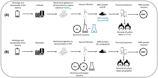 For the thermal pretreatment, the electrode pieces were first treated at a high temperature in a muffle furnace for binder removal and then immersed in a bi-distilled water solution with magnetic stirring to facilitate the separation of the active material from the aluminum foil. The powder was then filtered, weighed, dried, and recovered. In this case, no additional treatments are required since the powder is already purified from the binder and carbon black due to the degradation occurring at the high temperatures applied. A schematic representation of the process is depicted in Figure 1A.
