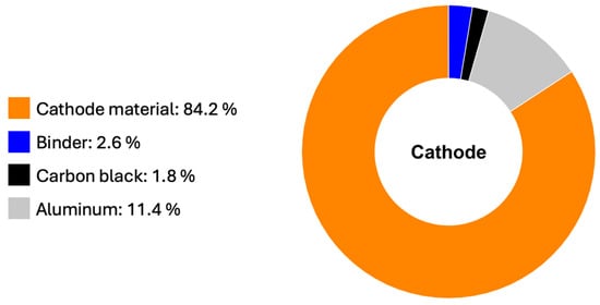 Preliminary tests were conducted on the battery cathode and anode to assess the binder fraction, the carbon black fraction, and the current collector fraction and to confirm the battery chemistry. From the TGA tests on the cathode, the weight loss up to 450 °C was associated with the oxidation of the binder, while the weight loss in the 450–550 °C range was associated with carbon black (see Figure S4 of the Supplementary Materials). Overall, the TGA results indicated a total fraction of the organic binder and carbon black of approximately 4.5 wt%. The aluminum mass fraction in the cathode sheet was determined using ICP-OES analysis. This technique enabled the quantification of the mass fractions of various elements in the cathode, as well as the stoichiometric composition of the cathode active material (see Tables S1 and S2 in the Supplementary Materials, respectively). A summary of the cathode composition is reported in Figure 3. The TGA test on the anode highlighted the oxidation temperature of the anodic graphite (Figure S5 of the Supplementary Materials). SEM images of the cathode and anode sheets are shown in Figures S6 and S7 of the Supplementary Materials.