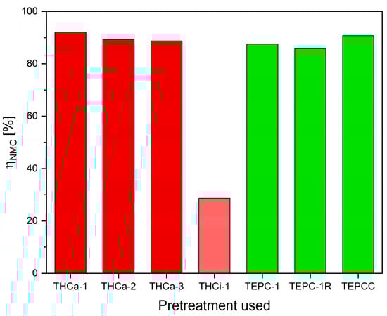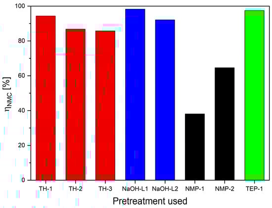 Figure 4 depicts the recovery efficiency for the various methods applied only to the cathode sheet listed in Table 1. By analyzing this parameter, it is clearly visible that the three pretreatment processes that have the higher recovery efficiency are the NaOH solution leaching with a recovery efficiency of 98% (NaOH-L1), the thermal pretreatment with a recovery efficiency of 94%, and the pretreatment using TEP with a value of 97%. The NMP solvent shows low recovery efficiency, probably due to the relatively low temperature used in the dissolution step.